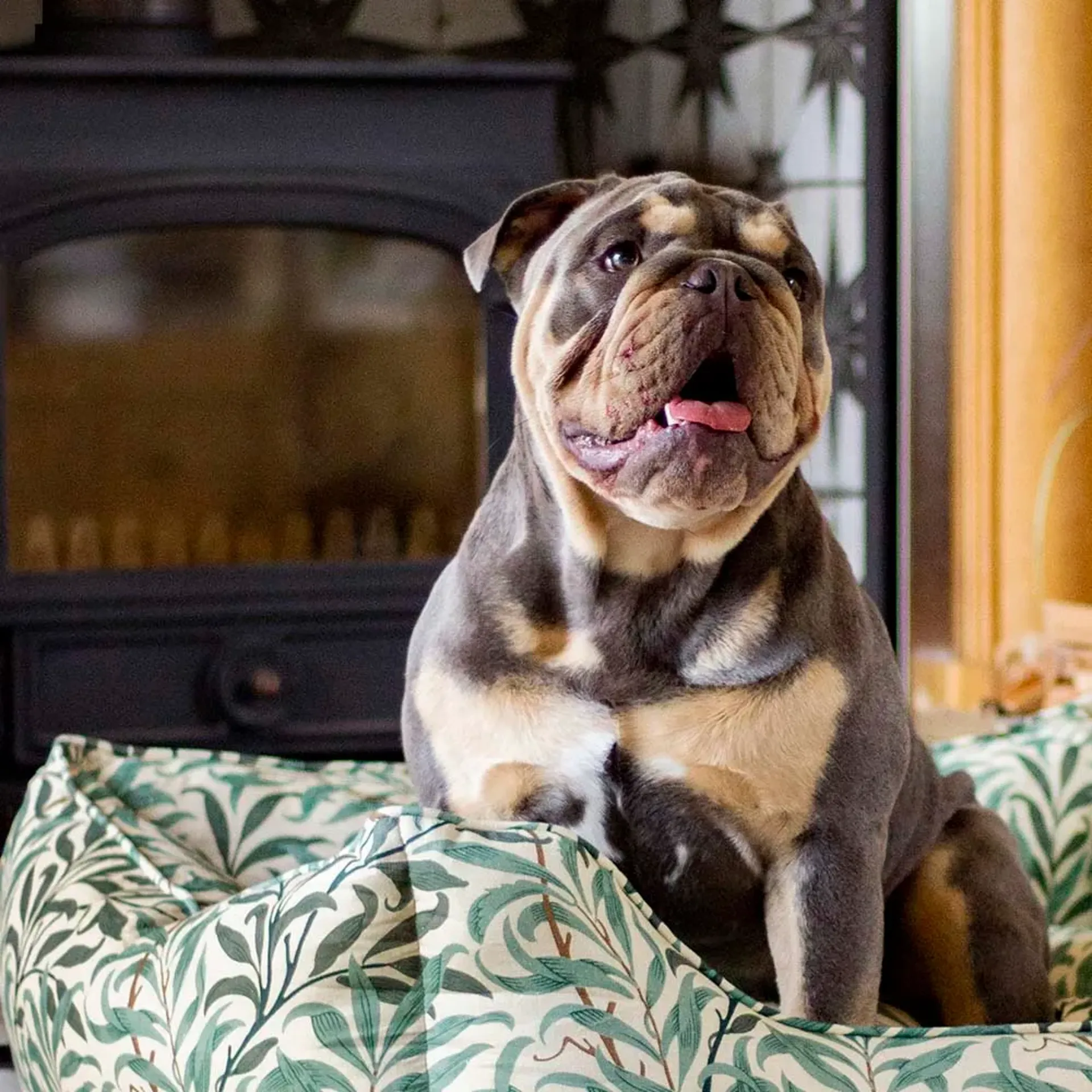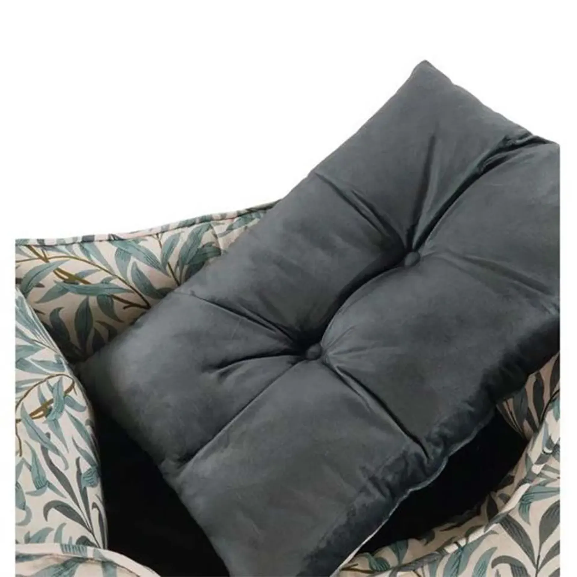 The Willow Boughs box bed features thickly padded sides for comfort and support, crafted from luxurious and ultra soft linen cotton blend. The inner cushion is reversible with the luxury print on one side and dark green velvet on the other.